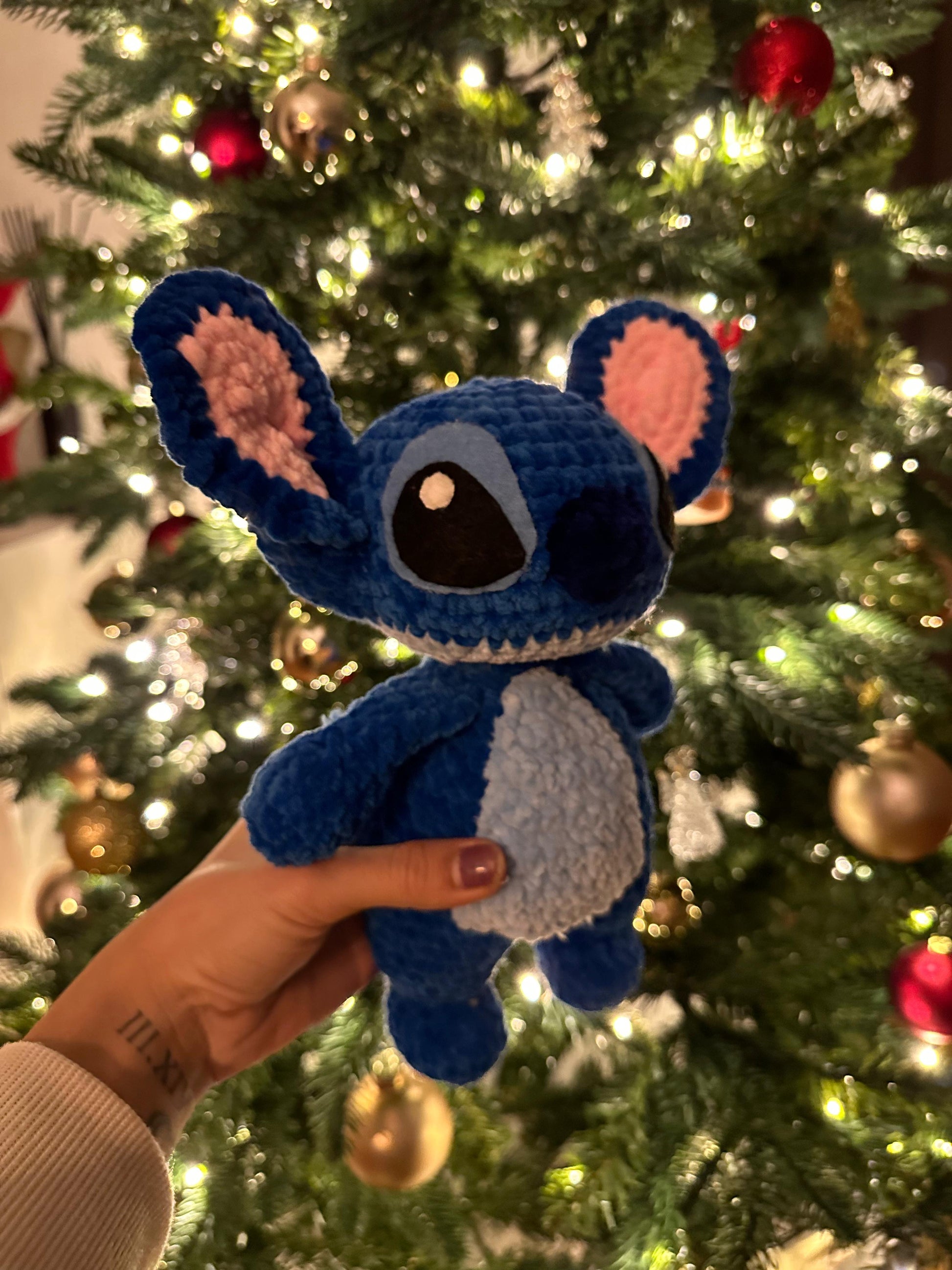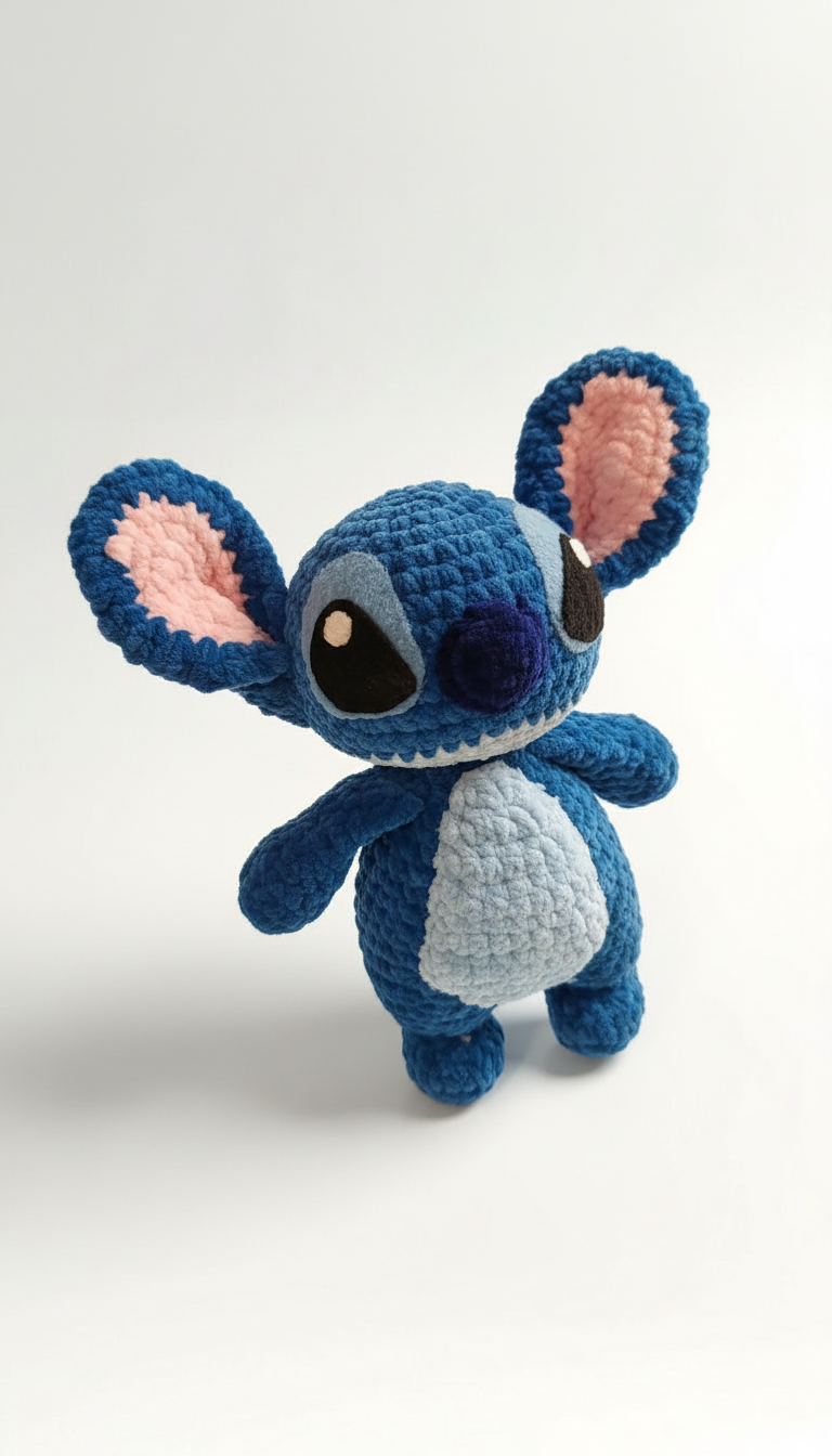 Dieses zuckersüsse, handgehäkelte Plüschtier wird sofort jedes Herz erobern. Die weiche, samtige Chenille-Wolle in kräftigem Blau verleiht ihm einen besonders kuscheligen Look. Die grossen, dunkelblauen Ohren mit zartrosa Innenflächen, die liebevoll gestickten Augen und der helle Bauch machen ihn zu einem echten Hingucker. Er hat eine runde, knuffige Körperform und wirkt dadurch besonders niedlich – perfekt zum Drücken, Dekorieren oder Verschenken 🎄💙