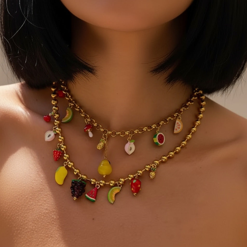 – Goldfarbene Gliederketten mit bunten Fruchtanhängern