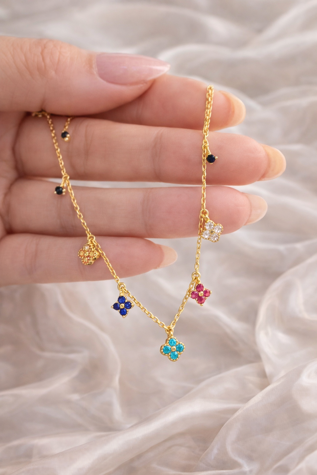 Dieses filigrane echt vergoldete Armband verzaubert mit zarten, vierblättrigen Blumen in harmonischen Farben und verleiht jedem Look eine elegante, feminine Note ✨ Die feine Kette kombiniert luxuriösen Goldglanz mit verspielten Details und ist ideal für den Alltag sowie besondere Anlässe.