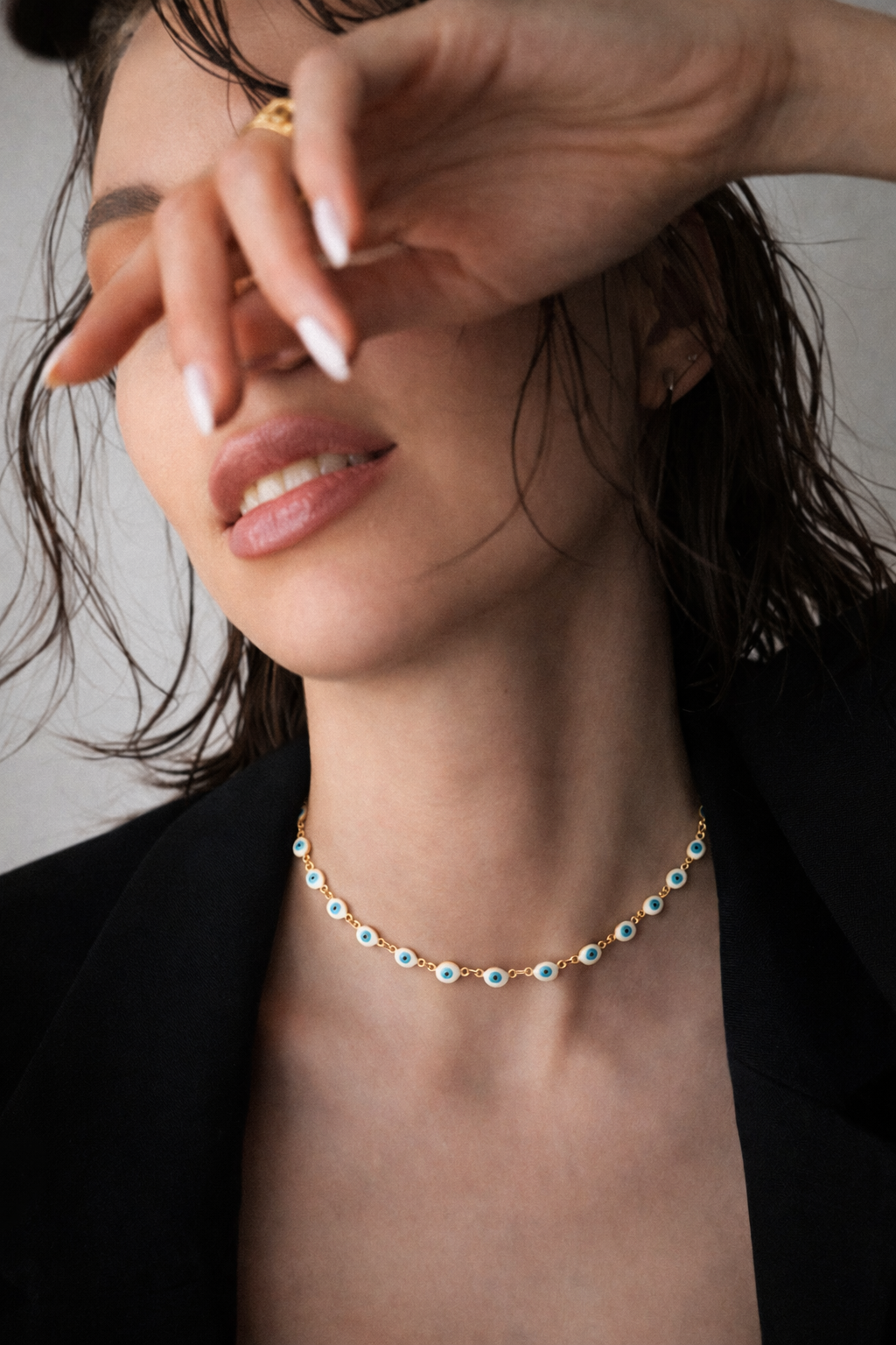 Diese elegante Edelstahlkette mit feinen Nazar-Augen-Elementen vereint zeitloses Design mit symbolischer Bedeutung. Die zarten, blau-weißen Augen stehen traditionell für Schutz vor negativen Energien und verleihen der Kette gleichzeitig einen modernen, stilvollen Look 🧿✨